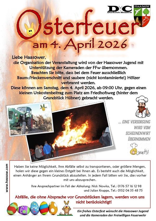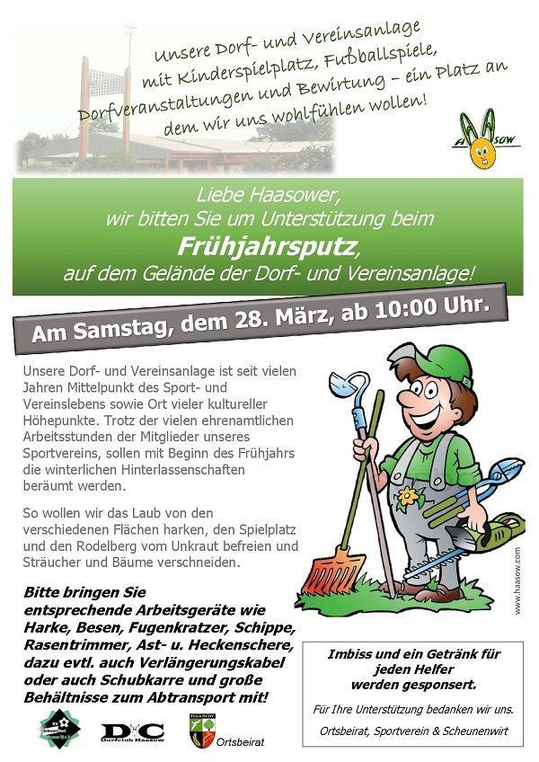 Allen Haasowern viel Freude und Spaß bei unseren Veranstaltungen, die immer für jeden und jede Altersgruppe organisiert werden. Beteiligen Sie sich bei den Vorbereitungen, unterstützen Sie die Initiatoren und genießen Sie die gemeinsamen Stunden mit Ihren Nachbarn, Verwandten und Freunden. Ansprechpartner sind jederzeit die Mitglieder des Dorfclubs, des Sportvereins, der Jugend, der Feuerwehr, der Muttigruppe und Kinderlachen Haasow e.V. oder der Volkssolidarität.