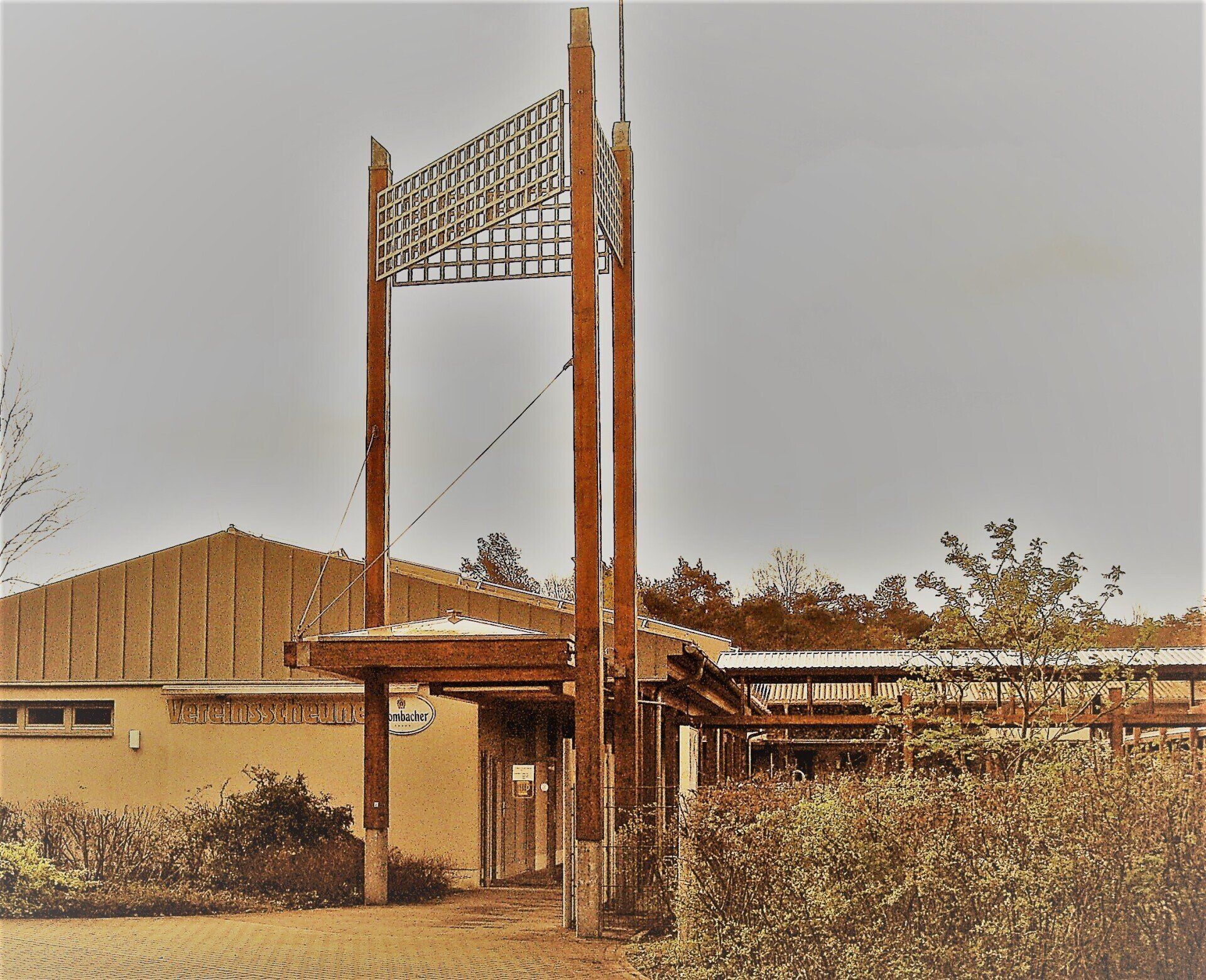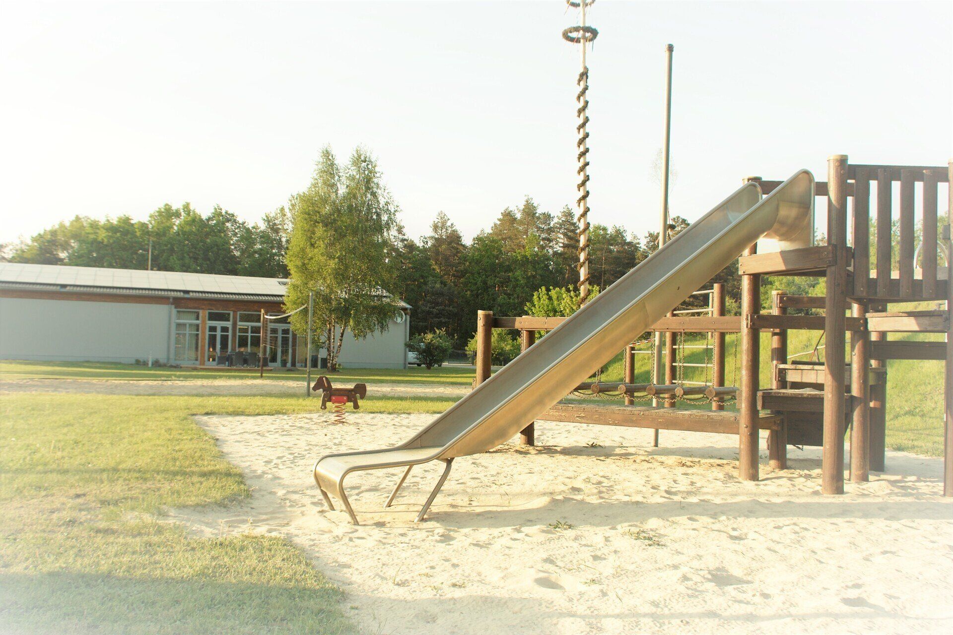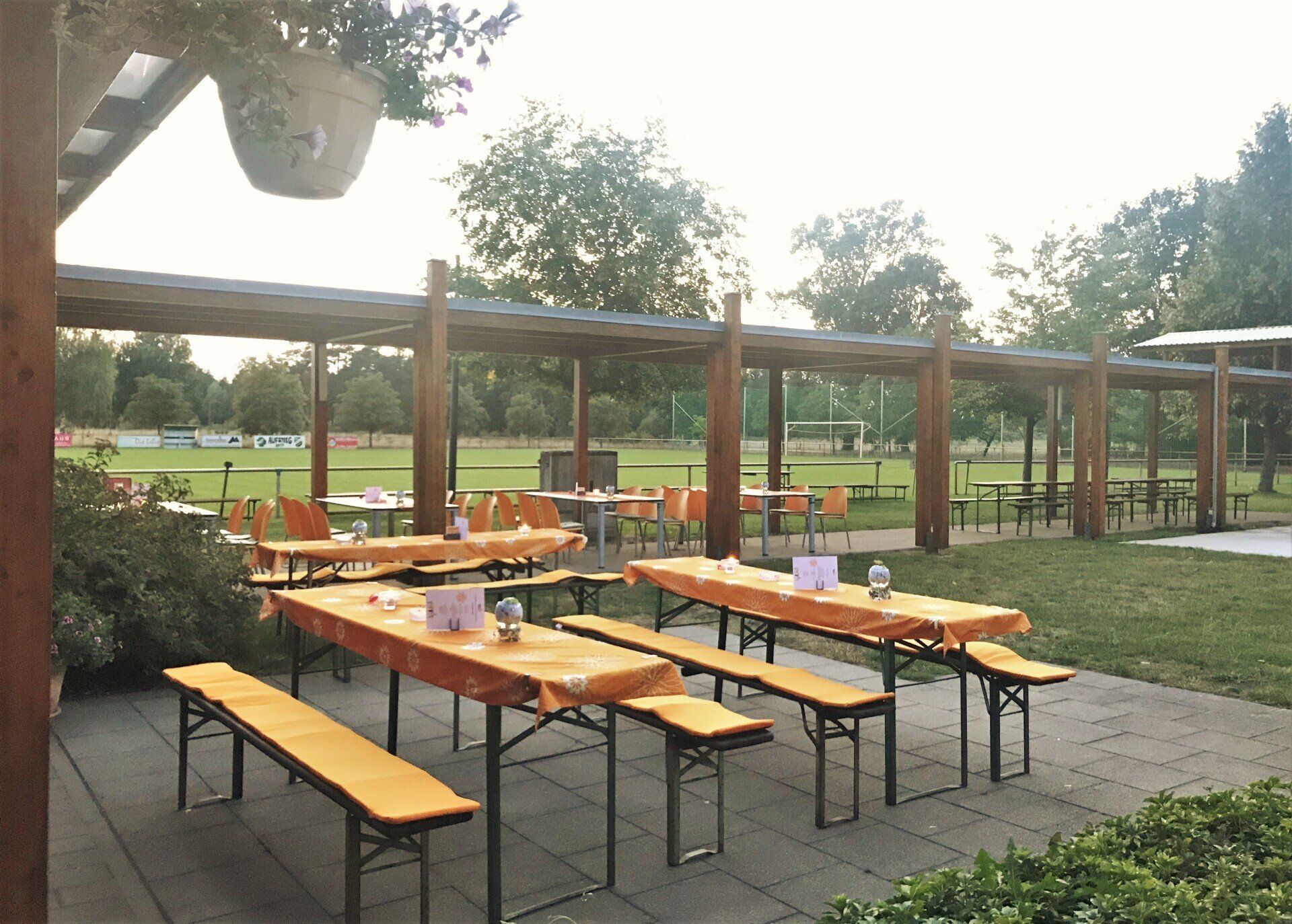 Außenbereich mit überdachter Sitz- und Veranstaltungsfläche, zwei Fußballplätze, Spielplatz, Rodelberg und Parkflächen